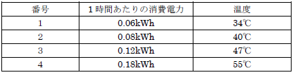 そこで、温度調節の目盛りの最低と最高の間を4 等分し、低い順から1、2、3、4と番号をふって、時間当たりの消費電力をワットチェッカーで測定した。ついでに温度計で炬燵内の温度も測定した。測定にあたっては、炬燵が冷えた状態から始めた。