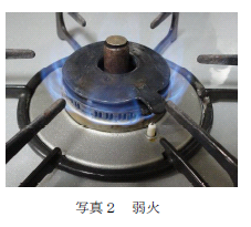 水1Lを沸騰させたあと、とろ火の状態(写真1参照)で火を保ち、蓋をした場合と蓋をしない場合で温度を比較した。